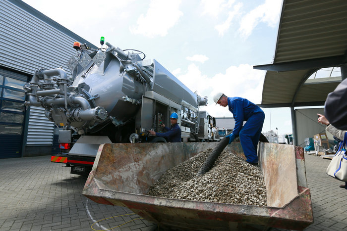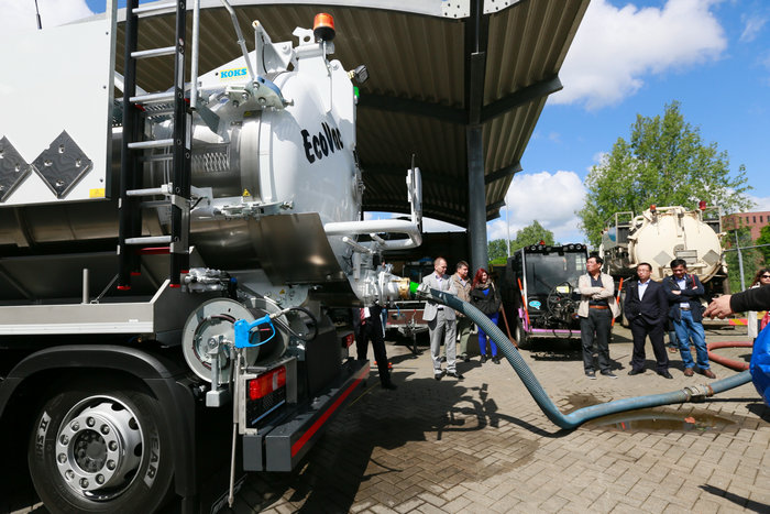 位于荷蘭阿爾克馬爾的KOKS集團公司是一家家族企業,主要生產用于收集、運輸工業液態或固體廢料及裝填催化劑用真空抽吸裝置。考察團參觀了其組裝和檢修車間,并觀摩真空抽吸槽車操作功能演示。在現場,一整車碎石,很短的時間就被完成抽吸。如需清理丁二烯罐等含有毒氣體的容器,此類抽吸裝置就更能發揮其安全、高效性能。此外,傳統作業中工業廢料的處理需經過收集、儲存及運輸等幾個環節,而這些環節都可由一輛真空抽吸槽車一條龍完成,避免作業銜接時廢物泄漏或暴露對環境的二次污染。