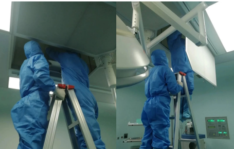 2020年2月10日,陜西省首例新型冠狀病毒感染孕婦在西安交大二附院經(jīng)剖宮產(chǎn)分娩,母嬰平安。手術成功的背后是手術室相關人員巨大的付出與努力,他們是在安全之路保駕護航最不為人知團隊。其中深海公司作為院內(nèi)維保單位,在分娩手術期間要保持手術室內(nèi)負壓狀態(tài)至少3小時以上,維保人員接到命令后第一時間調(diào)試空調(diào)機組,一次次試運行,一次次壓差監(jiān)測(保證壓差在-5pa~10pa),在排風口里噴灑消毒液進行消毒處理,術后更換回風口、排風口過濾器、高效過濾器,對所有途徑區(qū)域的設備進行消毒清洗更換,監(jiān)測終末消毒后物表,做塵埃粒子等指標監(jiān)測,確保手術室恢復正常運行。