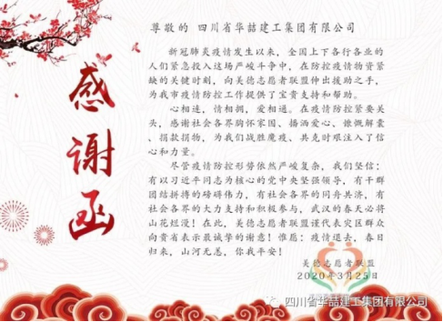 據(jù)悉,美德志愿者聯(lián)盟是一個因新冠疫情臨時集結的民間志愿者團隊,他們給予四川華喆建工集團有限公司的感謝信也是在沒有任何官方格式及官方署名的情況下,呈上的一封發(fā)自內(nèi)心的感謝信!